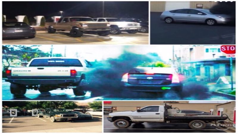- It’s manifested by blocking public charging stations with some kind of diesel vehicle usually a pickup truck, or revving the accelerator to produce an absurd amount of diesel exhaust to drown an electric or hybrid vehicle owner or bicyclist with such smoke they cannot see or breathe for a few seconds or minutes.