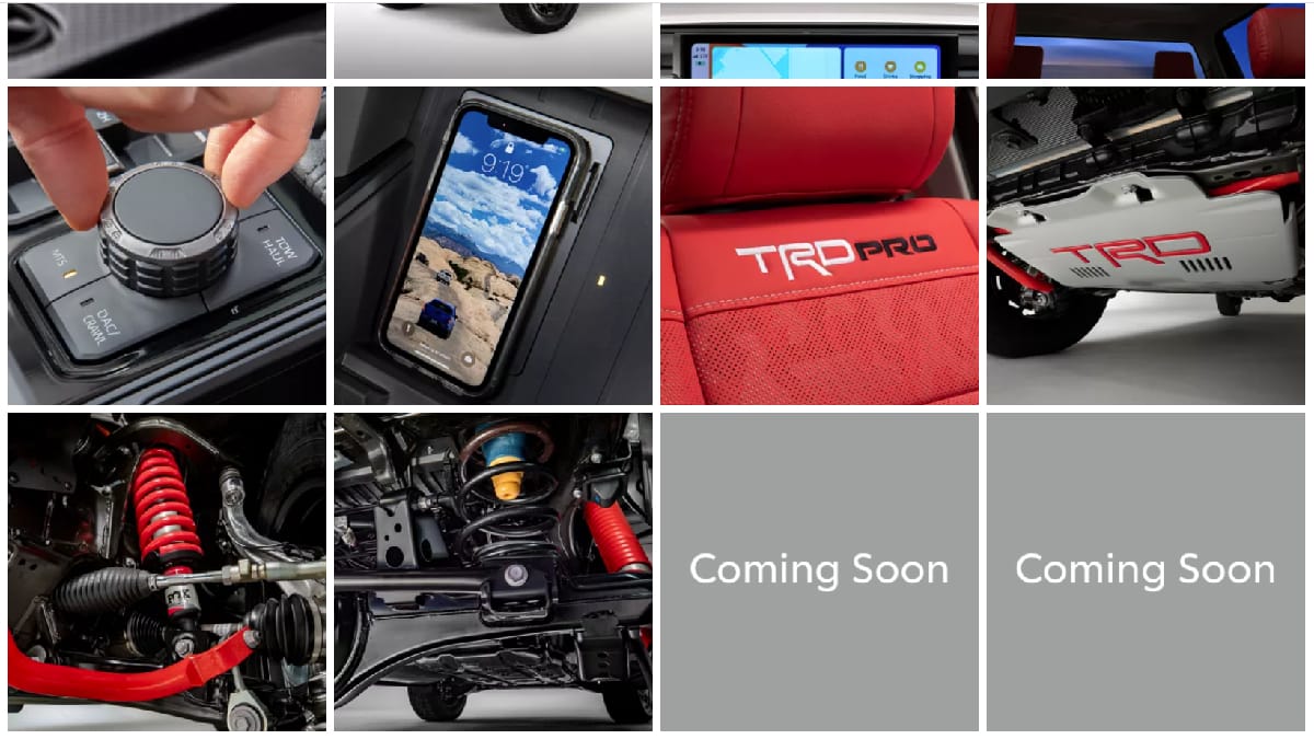 We know there will be a TRD skid plate with red lettering. There will be FOX shocks and multi-link rear suspension with coil springs.