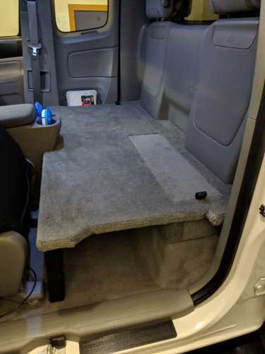 Same thing applies to this special Toyota Tacoma Access Cab. Not a ton of back seat passenger room but it is designed to be that way. “If you build it they will come.” Build a comfy cozy platform and your puppies will be so grateful and can travel with their best friend everywhere. Happy times and happy best friends.