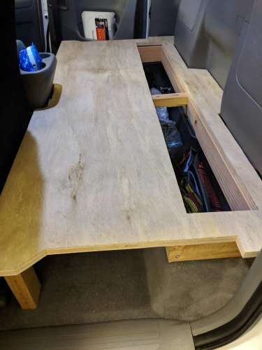 I did this years ago for my 2016. It doesn’t need to be anywhere near that elaborate. A single padded upholstered board (18x48) with altered stud hangers for hooks on the back. Just flip the seats down and hook it on the kid seat retainers. Comes out in about 10 seconds and a human can use it.
