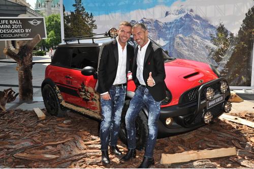 The Life Ball Mini 2011, which most certainly the fashion duo never laid a wrench to, is based on a standard Mini Cooper S and features a raised ride height and large off-road tires along with a "front guard, rally headlamps and tinted side windows with grilles." The spare tire is mounted on the tailgate.