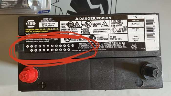 In my case, the markings on the old battery would have signified that the battery was purchased in 2016, not bad there still should have been a warranty on it, right? Hardly. Here is what my friends enlightened me on. This second picture you see is also an indication of when the battery was manufactured—another clue they use to determine when it was purchased. My old battery had a 4/16 tag indicating it was produced in April of 2016.