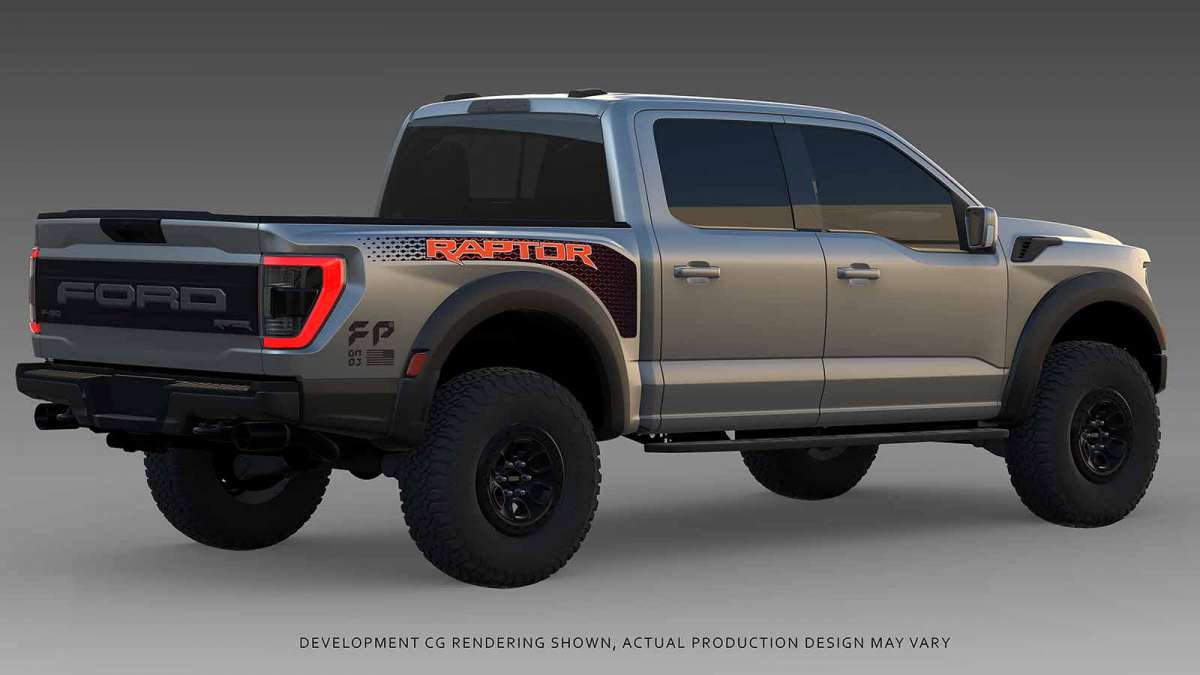 Like the entire 2021 Raptor, the optional Raptor graphics package was inspired by the F-22 Raptor fighter jet. The diamond-shaped pattern is meant to resemble the F-22’s diamond shaped afterburner exhaust nozzles and the “FP GN03” logo gives Raptor authentic fighter jet trail markings.