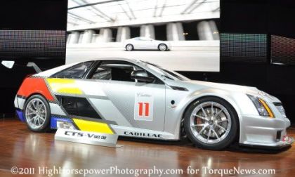 The driver’s side profile of the Cadillac CTS-V Coupe race car at the 2011 Detroit Auto Show