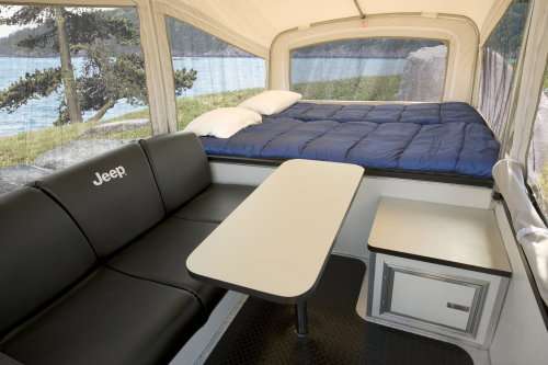 Advertising Advertising Showing the Jeep Camper Trailer opened up with the couch, table and bed shown. News Categories Gallery Advertising Advertising