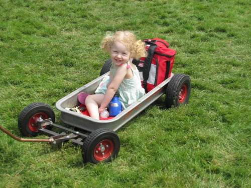 Rachel didn't want her pic taken at first until I said her name after asking permission of her dad, as that is my daughter's name as well. Little Rachel here adorned a Greyhound wagon with a special steering mechanism likely invented by her father or it was stock.