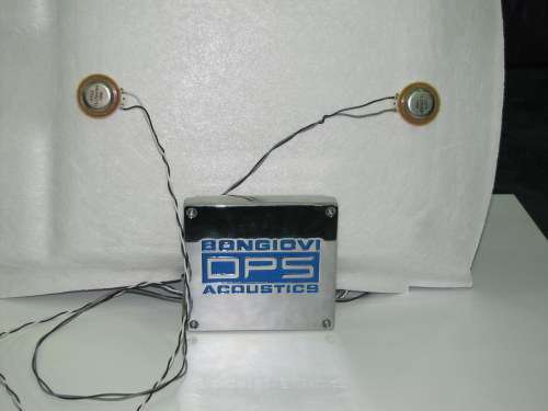 Those small disc-shaped objects are the transducers attached to the non-show side of a miniature version of an autmotive headliner. And the small size of the transducer is what has automotive designers and integration engineers so excited. All that's needed now is to convince the sound engineers.