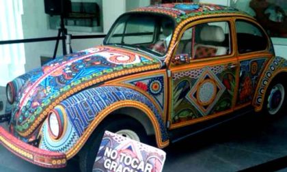 The indigenous Huichol tribe of Jalisco and Nayarit, Mexico is known for their exquisite and colorful designs and decorations in beadwork – now they have applied their stylish art to a VW Beetle completely covered with 200 lbs. of the tiny beads as part of a project for the Museum of Popular Art in Mexico City.